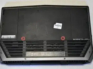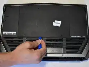 Разместите ноутбук перевёрнутым, с hinges, обращёнными к вам, затем удалите два винта Philips #0 по 9 мм, расположенные в центре задней панели. Снимите заднюю панель, используя инструмент для открытия iFixit, чтобы отделить её от задней части ноутбука.