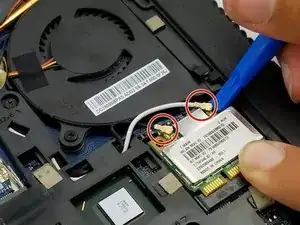 Используя голубой пластиковый открывающий инструмент, осторожно снимите разъемы с Wi-Fi карты.