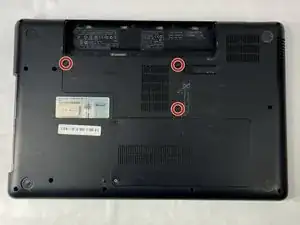 Поместите ноутбук на чистую, ровную поверхность дном вверх.