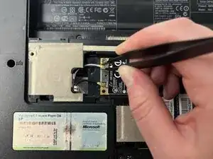 С помощью тонкого антистатического инструмента или пинцета подденьте провод до упора к разъему и поднимите его вверх от платы, чтобы отключить коаксиальные кабели от Wi-Fi карты.