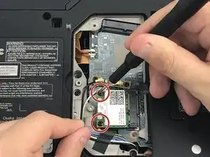 Очень осторожно подденьте два соединителя, прикрепленных к Wi-Fi карте, используя плоский конец лопатки.