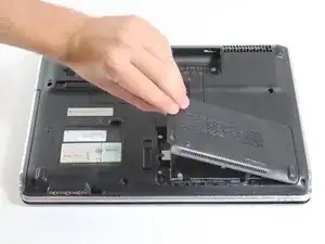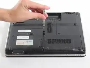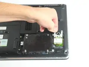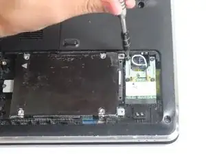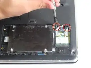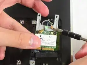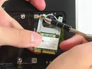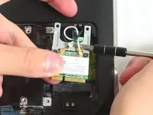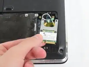 После извлечения батареи снимите крышку корпуса на задней части ноутбука, затем отсоедините два провода, подключённых к Wi‑Fi адаптеру/карте, и в завершение извлеките сам адаптер/карту.