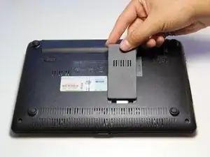 Удерживая этот штифт в положении «разблокировано», другой рукой потяните батарею горизонтально от корпуса ноутбука.