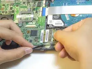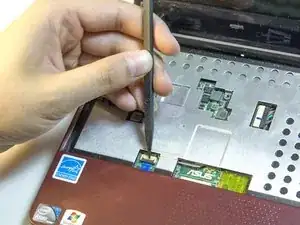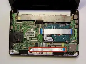 Острым концом лопатки отсоедините ленточный кабель, идущий от нижней части клавиатуры к плате, нажав на места его подключения.