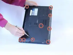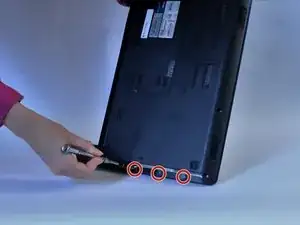 Положите ноутбук лицевой стороной вниз, батарея должна быть сверху.