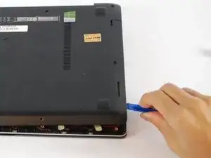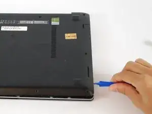 Используя пластиковый инструмент для открытия, аккуратно подденьте дно ноутбука. Медленно перемещайте его по краям, поворачивая время от времени, чтобы освободить дно ноутбука из зажимов, которые его удерживают.