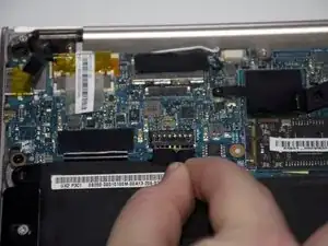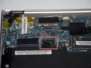 Используя инструмент для открывания iFixit и другую руку, аккуратно поднимите разъем от скотча, обернутого вокруг проводов разъема, и аккуратно отсоедините разъем от материнской платы.