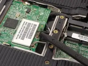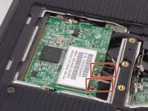 Отключите кабели беспроводных антенн от WiFi-карты, осторожно поднимая металлическую часть разъема с помощью лопатки или пластикового инструмента для открытия.