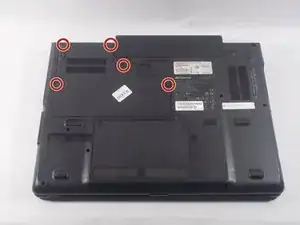 Переверните ноутбук и выньте пять винтов Philips #0 (5 мм), фиксирующих крышку отсека Wi‑Fi карты.