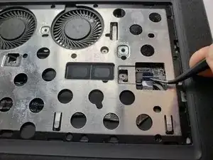 Используйте синее приспособление для вскрытия, чтобы аккуратно дальше отделить рамку клавиатуры.