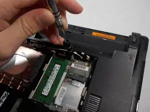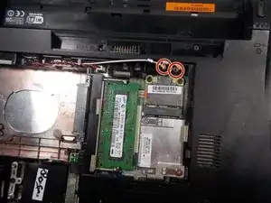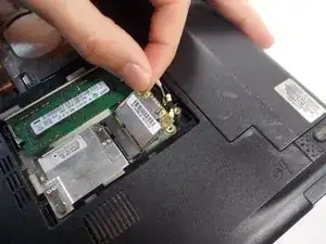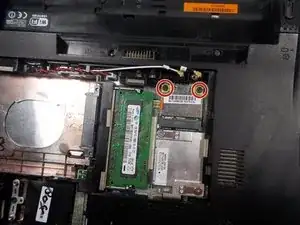 Найдите WiFi карту, следуя за черно-белыми проводами внутри ноутбука.