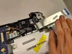 Отключите крупную плоскую ленту проводов. Поднимите её в сторону, чтобы открыть доступ к Wi‑Fi карте.