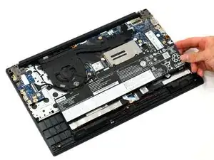 Снимите аккумулятор, аккуратно приподняв его верхнюю часть из рамы, затем потяните в направлении материнской платы.