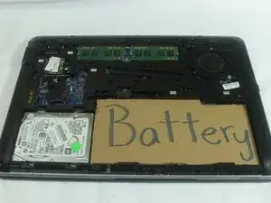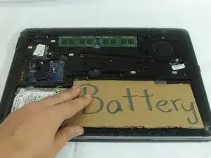 Аккуратно поднимите аккумулятор (представленный этим картонным вырезом), пока он не отсоединится. После отключения аккумулятора поднимите его от ноутбука.