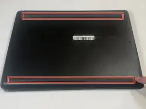 Подденьте пластиковым инструментом для вскрытия заднюю крышку рядом с петлями экрана. Аккуратно приподнимите по обеим сторонам.