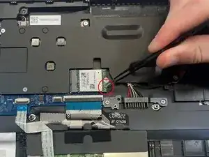 Подденьте тонким антистатическим инструментом или пинцетом провод до прилегания к разъёму и аккуратно поднимите его перпендикулярно плате, чтобы отсоединить коаксиальные кабели Wi‑Fi.