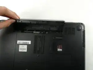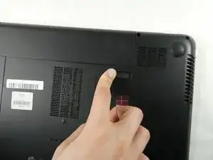 Сдвиньте фиксатор аккумулятора в правой части ноутбука.