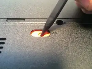 Переверните ноутбук и осмотрите заднюю панель. Найдите ярко‑оранжевый фиксатор, как показано на изображениях слева.
