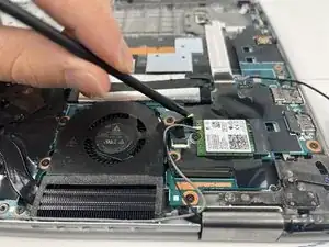 С помощью лопатки отсоедините серый и чёрный коаксиальные кабели от Wi‑Fi‑карты.