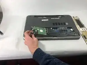 Схватив за левую сторону жёсткого диска, сдвиньте деталь влево и потяните вверх, поднимая её и выводя из устройства.
