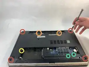 На нижней стороне ноутбука используйте крестовую отвертку, чтобы удалить всего девять винтов длиной 5 мм из следующих мест: