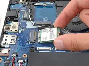 При сборке вставьте WLAN‑карту под небольшим вниз направленным углом и прижмите, чтобы зафиксировать её оставшимся клеем.