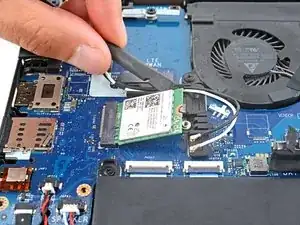 Используйте лопаточку или чистый ноготь, чтобы поддеть насечённый край WLAN‑карты, пока она не поднимется под небольшим углом.