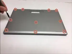 С помощью отвертки Phillips #0 удалите десять винтов длиной 7мм, удерживающих заднюю крышку на месте.