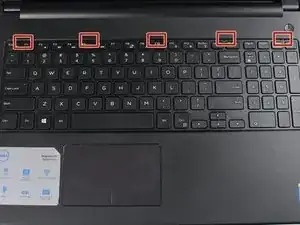 Держа ноутбук открытым и расположенным вертикально, используйте лопатку, чтобы поддеть защёлки, показанные на изображении.
