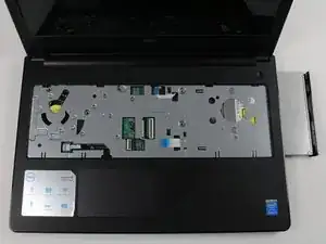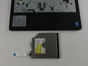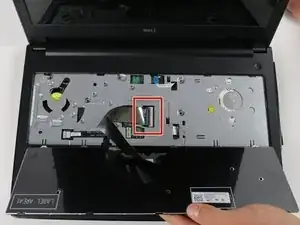 Держа ноутбук вертикально — отсоедините шлейф оптического привода, подняв белую фиксирующую планку и аккуратно вытянув шлейф из разъёма.