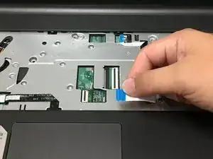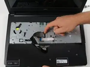 Осторожно переверните клавиатуру, чтобы открыть шлейф под ней. Отсоедините шлейф от материнской платы, подняв белую фиксирующую планку и аккуратно вытянув шлейф из разъёма.