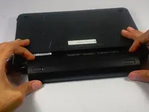 Держите левый переключатель нажатым, потяните батарею к себе, чтобы вынуть её из компьютера.