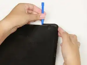 Поместите инструмент для открытия в выемку между корпусом Chromebook и задней крышкой.