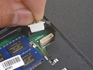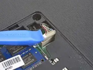 Используйте инструмент для вскрытия, чтобы поддеть кабель разъема ethernet из его гнезда рядом с модулем оперативной памяти.