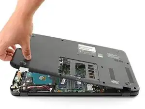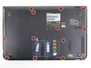Следуйте этому руководству, чтобы снять заднюю крышку ноутбука Toshiba L55. Для этого потребуется частично снять DVD SuperMultiDrive, так как металлическая защелка находится под ним.