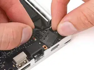 Используйте пинцет с тупыми концами или пальцы, чтобы отклеить и снять прокладку кабеля аккумулятора.