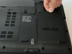 Разместите ноутбук так, чтобы он был перевернут вверх дном и обращен от вас. Панель жесткого диска находится справа.