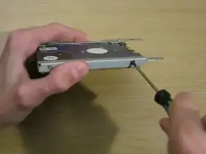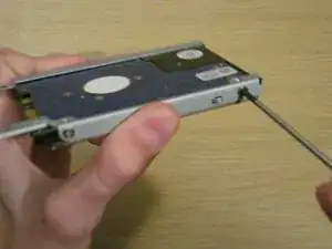 С каждой стороны жесткого диска есть небольшая металлическая скоба с двумя маленькими винтами Phillips #00, закрепляющими скобу на диске.