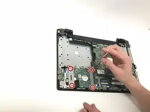 Найдите жесткий диск в нижнем левом углу ноутбука. На серебряной пластине, удерживающей жесткий диск, удалите четыре винта M2X3 мм в каждом углу (смотрите красные круги для местоположения винтов).