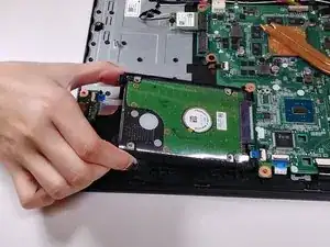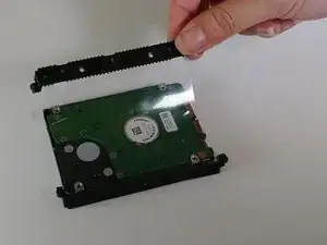 Используя пластиковые язычки, слегка поднимите жесткий диск и потяните влево.