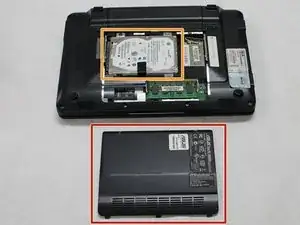 Осторожно переверните ноутбук так, чтобы батарея была обращена от вас. Батарея выделена красным прямоугольником на фотографии слева.