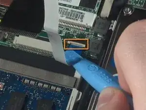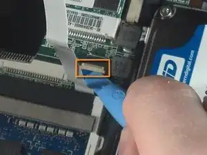 Вставьте пластиковую лопатку под небольшой выступ белого разъёма шлейфа и поднимите его вверх, чтобы разъём на материнской плате открылся.