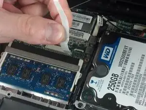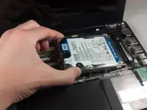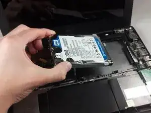 Продолжайте вытягивать жёсткий диск из разъёма, пока он полностью не освободится от остальных компонентов ноутбука.