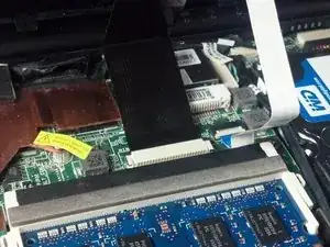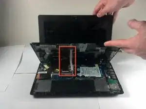 Аккуратно потяните чёрный шлейф горизонтально в сторону дисплея, пока он не выйдет из белого разъёма на материнской плате. Если шлейф не выходит, повторите предыдущие действия, пока он не освободится.