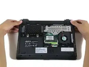 Сдвиньте батарею к себе и поднимите её из ноутбука.