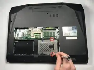 Переверните ноутбук и открутите два винта по 4 мм, расположенные на дне ноутбука с помощью отвертки PH0.