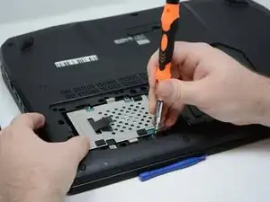Поверните компьютер вверх дном и приподнимите резиновую заглушку на задней панели, чтобы получить доступ к держателю винта Phillips #2.