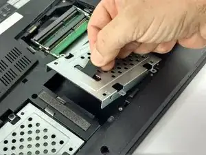 Возьмитесь за язычок и приподнимите корпус жёсткого диска, затем оттяните жёсткий диск от разъёма.