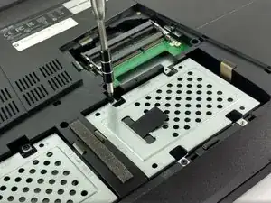 Удалите винт Phillips #00 длиной 5,3 мм, фиксирующий крышку доступа к оперативной памяти.
