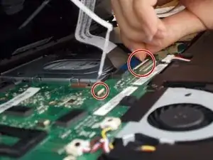 Существуют два небольших кабеля клавиатуры, соединяющие ее с ноутбуком. Осторожно снимите их, поднимая белые зажимы, которые их удерживают, и вытащите разъем.